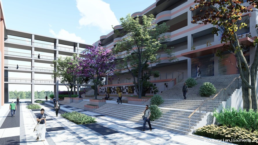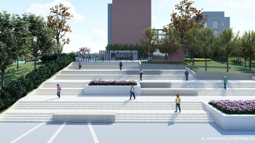 本项目位于自贡市高新区,场地内高差较大,本次设计以规整式布局为主,局部地区采用自然式布局,设计了四大区:入口区、教学区、活动广场区、活动操场区。其中两处入口区(东大门、西大门)、教学区以及活动广场与操场间的过渡带都利用高差或设计了分级花坛、休憩坐凳或利用特色铺装打破台阶的单调,除此之外每个区均结合教育、学习文化进行了小品的设计展示,营造了充足的学习氛围。如教学区间的中庭结合书法以及儒家思想中的“格物致知”对墙面进行美化;广场区内的花坛中摆放了镌以篆书的“竹简”雕塑。本次的设计成果能为学生、老师提供一个优美的学习、工作、休息、活动场所。