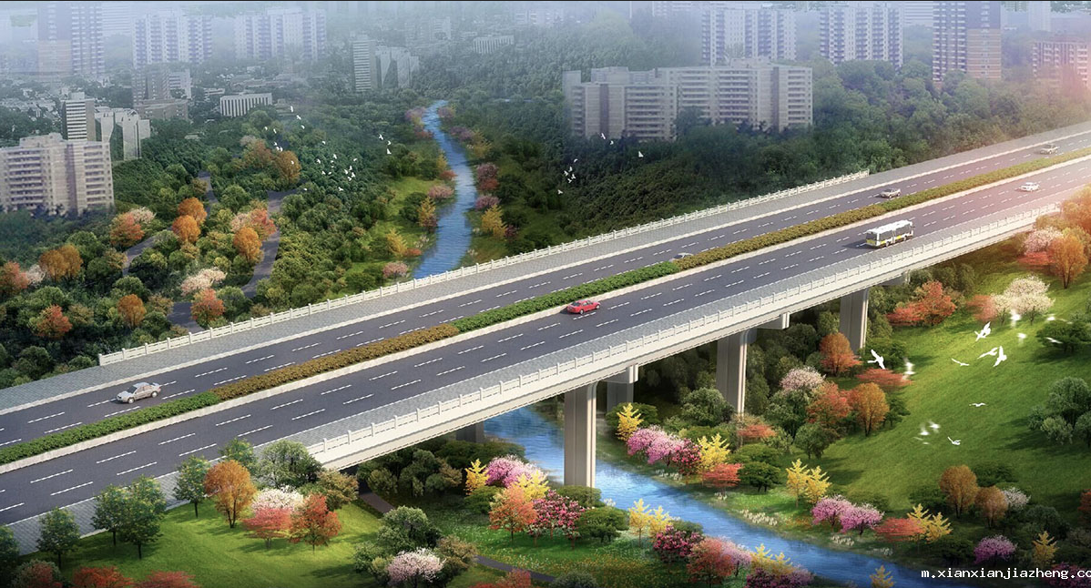 工程特点:两座桥梁均为跨越李白河而设,上部结构均采用4×30m预应力简支小箱梁,桥梁为跨越天然河沟及结合河道景观打造的城市高架景观桥梁